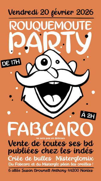 Avis aux nantais : nous organisons également une Rouquemoute Party spéciale Fabcaro le vendredi 20 février dans notre bar librairie Chez Rouquemoute ! Toutes les infos sont ici.