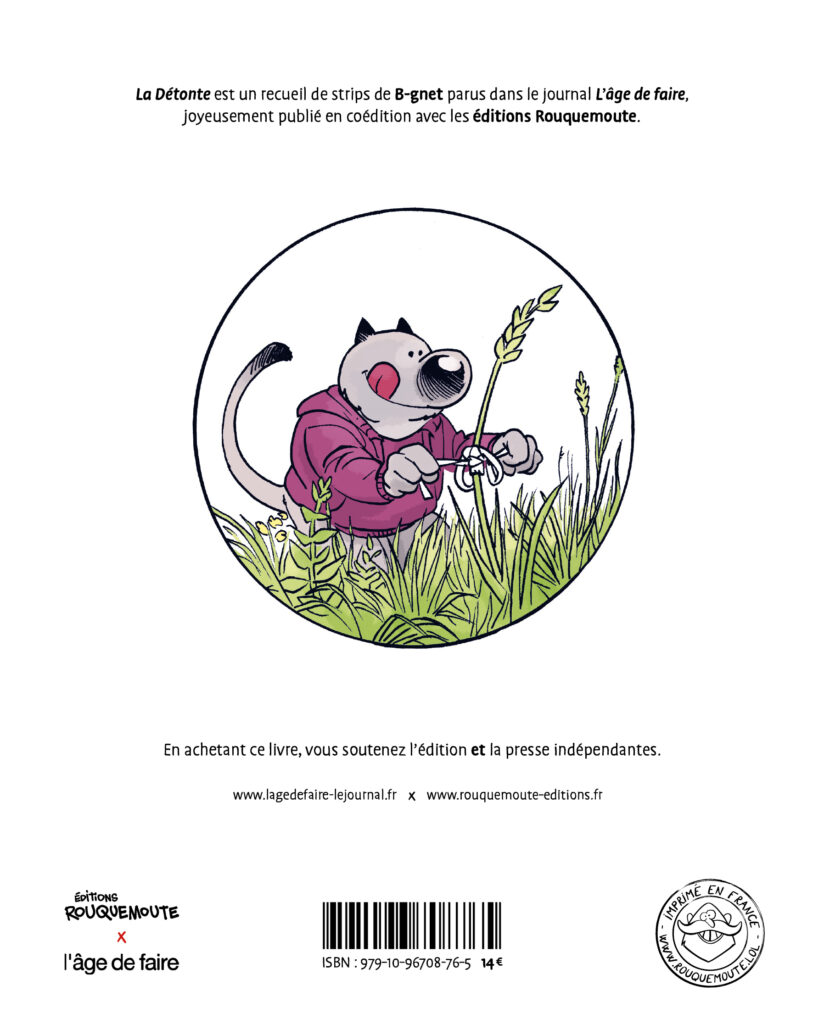 Fruit d’une belle rencontre entre édition et presse indépendantes, La Détonte est un recueil de strips de B-gnet parus dans le journal L’âge de faire, publié en coédition avec les éditions Rouquemoute. Mensuel imprimé à plus de 16000 exemplaires (9000 abonnés et 7000 exemplaires distribués via un réseau alternatif de diffuseurs), L’âge de faire est édité par une société coopérative (SCOP). Ce canard écolo, militant, solidaire et joyeux comprend 24 pages d’articles écrits en totale indépendance et épargnés de toute pollution publicitaire. Maison d’édition de bandes dessinées indépendante, Rouquemoute mise sur le local et l’anti-gaspi, avec une ligne éditoriale estampillée humour. Ses livres sont imprimés à moins de 100 km de ses bureaux nantais, à l’imprimerie Pollina, en Vendée. Les strips de B-gnet sont publiés dans L’âge de faire depuis 2016. Décalé, délirant, décidé parfois et volontiers fainéant, le personnage qu’il a créé promène les lecteurs dans la Nature, dans son jardin, ou simplement dans son salon, mais la ville n’est jamais loin. Au gré des cases, il pointe les contradictions de notre société connectée, artificielle, et se régale du “fais-le-toi-même”.