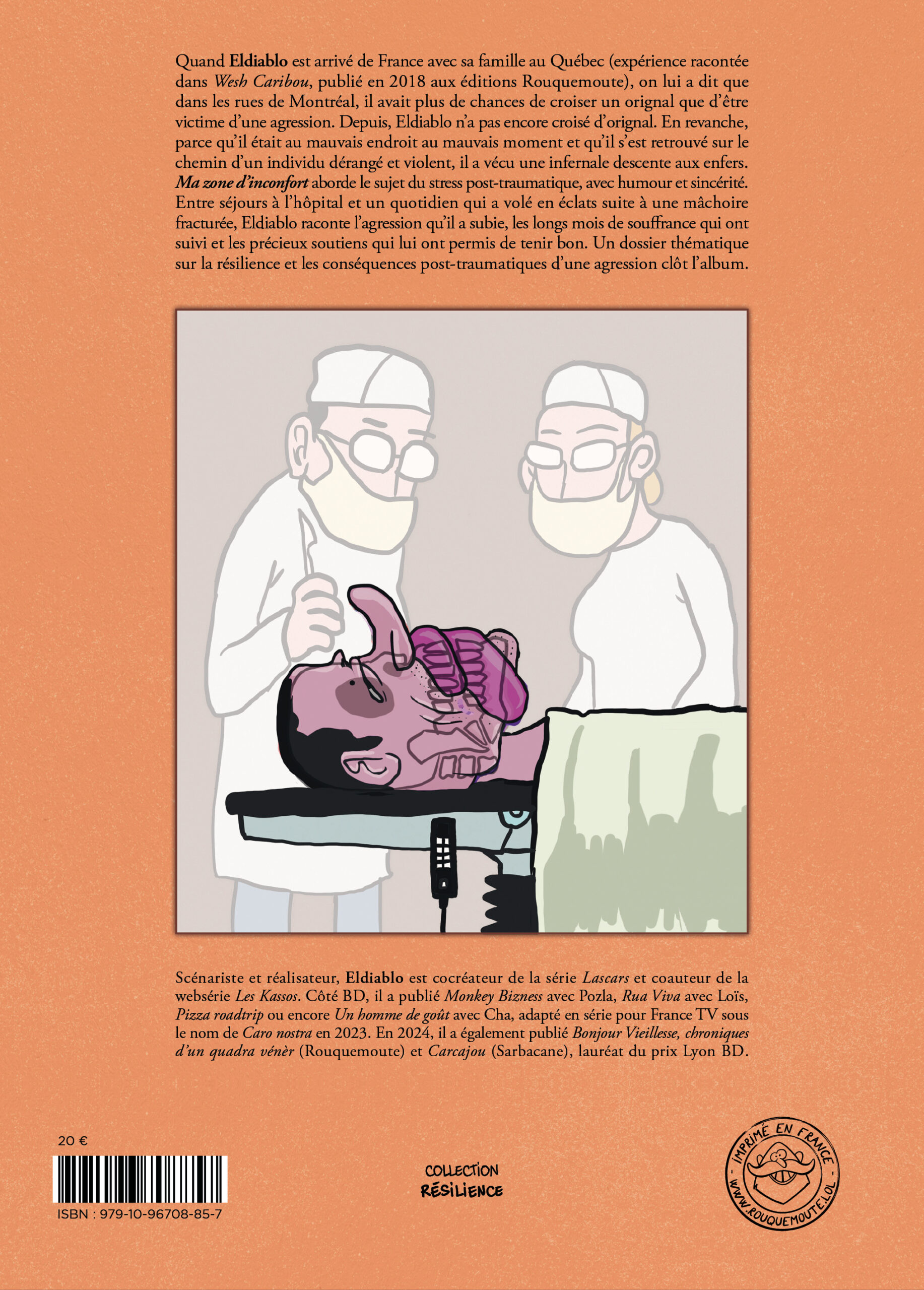 Quand Eldiablo est arrivé de France avec sa famille au Québec (expérience racontée dans Wesh Caribou, publié en 2018 aux éditions Rouquemoute), on lui a dit que dans les rues de Montréal, il avait plus de chances de croiser un orignal que d’être victime d’une agression. Depuis, Eldiablo n’a pas encore croisé d’orignal. En revanche, parce qu’il était au mauvais endroit au mauvais moment et qu’il s’est retrouvé sur le chemin d’un individu dérangé et violent, il a vécu une infernale descente aux enfers. Ma zone d’inconfort aborde le sujet du stress post-traumatique, avec humour et sincérité. Entre séjours à l’hôpital et un quotidien qui a volé en éclats suite à une mâchoire fracturée, Eldiablo raconte l’agression qu’il a subie, les longs mois de souffrance qui ont suivi et les précieux soutiens qui lui ont permis de tenir bon. Un dossier thématique sur la résilience et les conséquences post-traumatiques d’une agression clôt l’album.